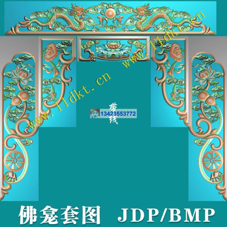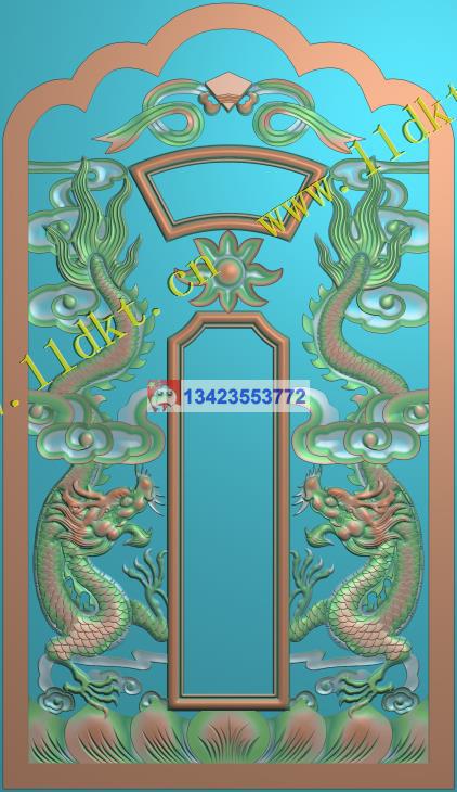 带线精雕图灰度图佛龛神台牌位灵位双龙戏珠顶花莲花帽头葫芦铜钱边框挂落
