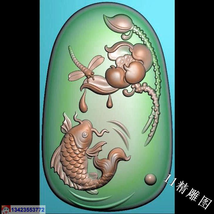 玉雕椭圆弧面蜻蜓莲花鲤鱼挂件精雕图