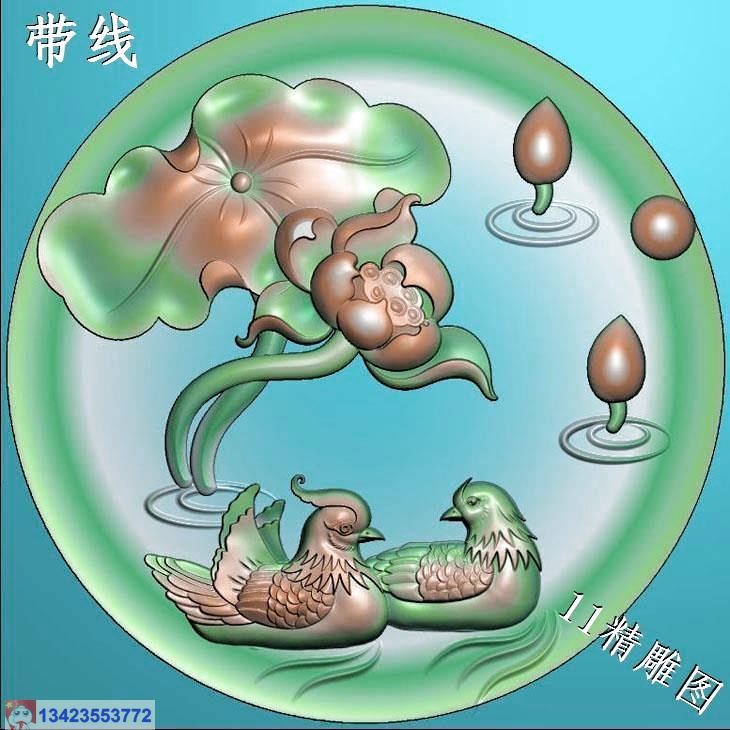 圆形凹底荷花鸳鸯挂件带线精雕图