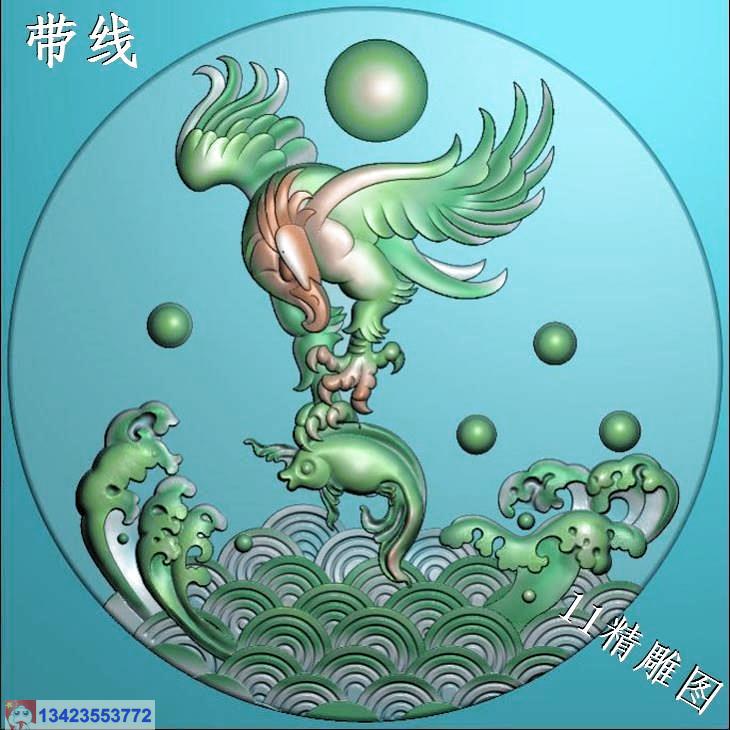 圆形老鹰抓鱼挂件带线精雕图