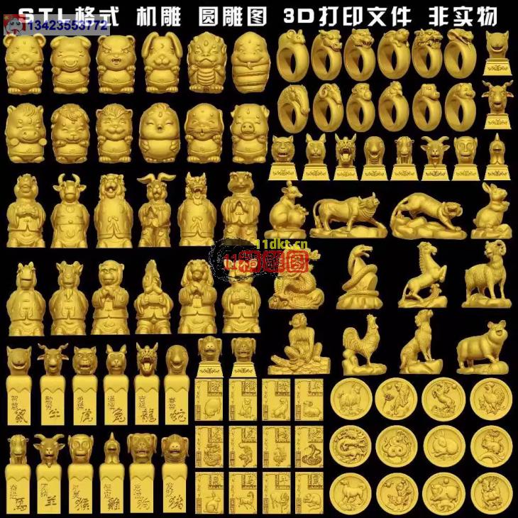十二生肖动物戒指玉牌圆雕图STL文件3D打印模型图纸合集打包