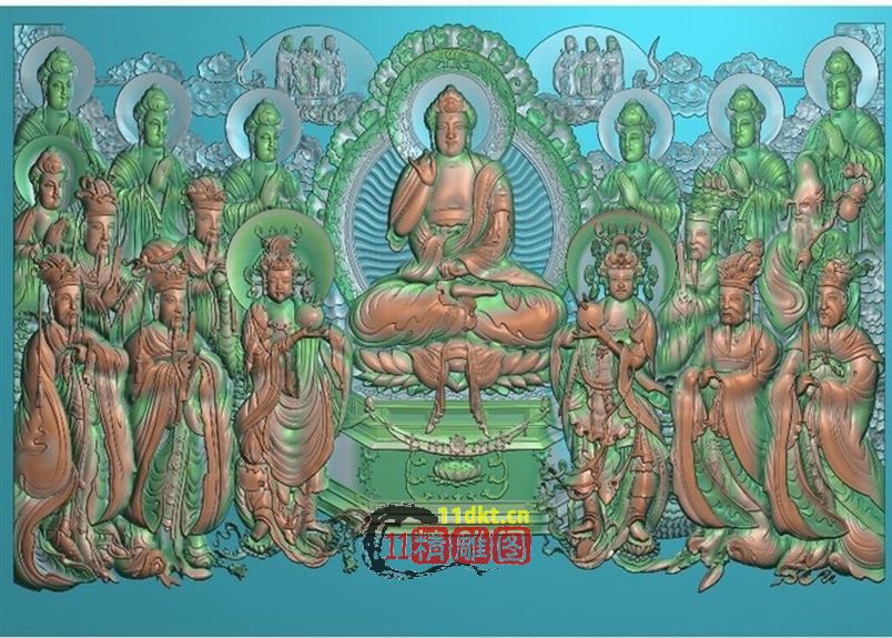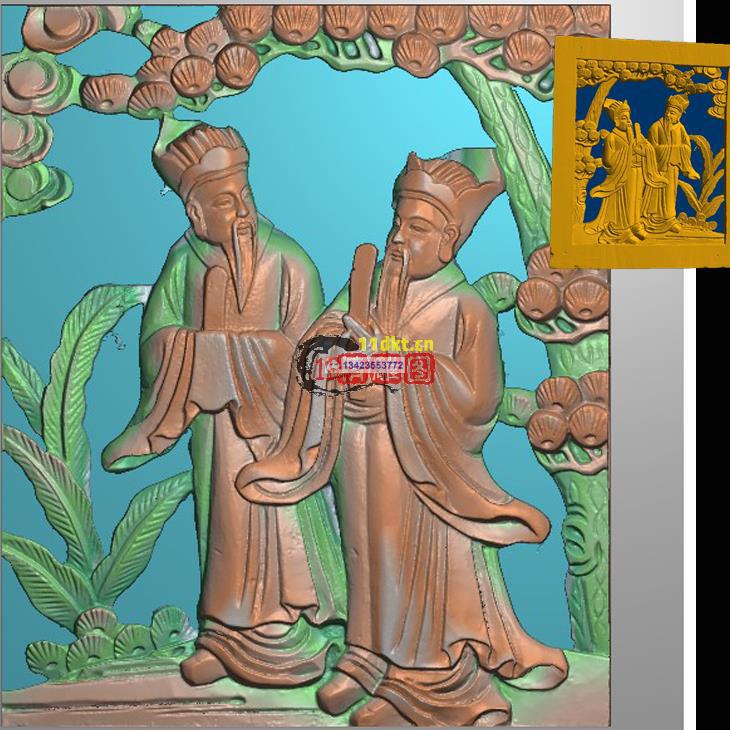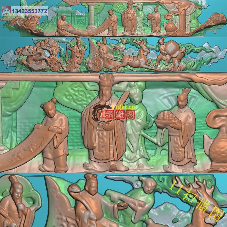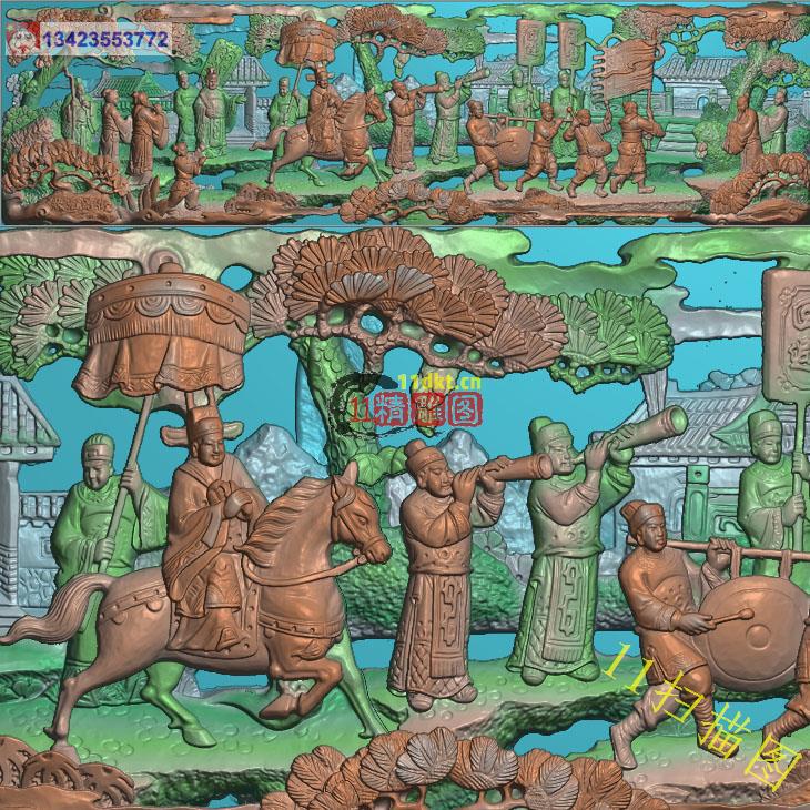 五路财神人物精雕图古建筑祠堂寺庙石雕浮雕木雕扫描图彩眉横版新