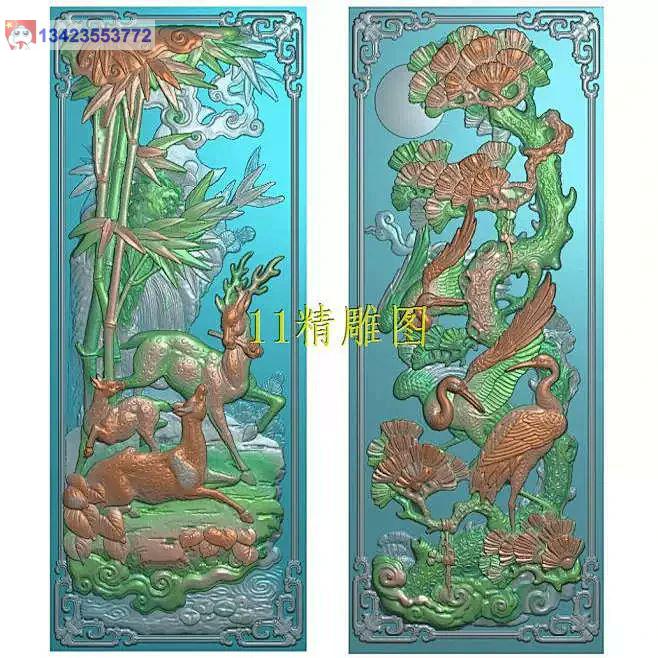新款松鹤延年鹿竹同春古建浮雕精雕图宗祠门楼壁堵石雕扫描竖屏