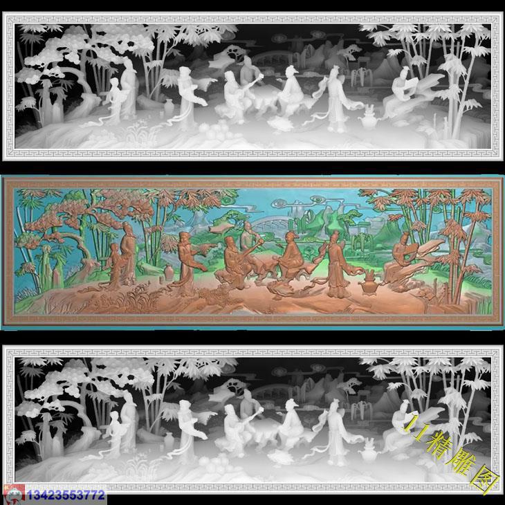 竹林七贤山水人物横屏挂匾扫描图精雕图灰度图