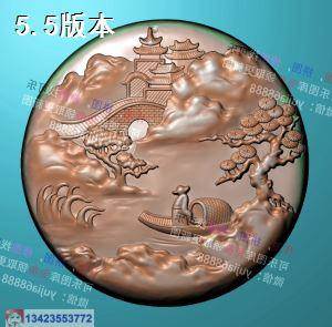 阁楼 山水圆牌 精雕图 浮雕图 玉雕图